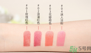 #O1玫瑰紅色:這款能給唇自然血色的半啞光效果,質(zhì)感的暗紅色,是比較自然的紅色,日常涂都可以;#02浪漫紅色:如同染色唇液般顯色,鮮明的細(xì)膩啞光質(zhì)感的櫻桃紅色。